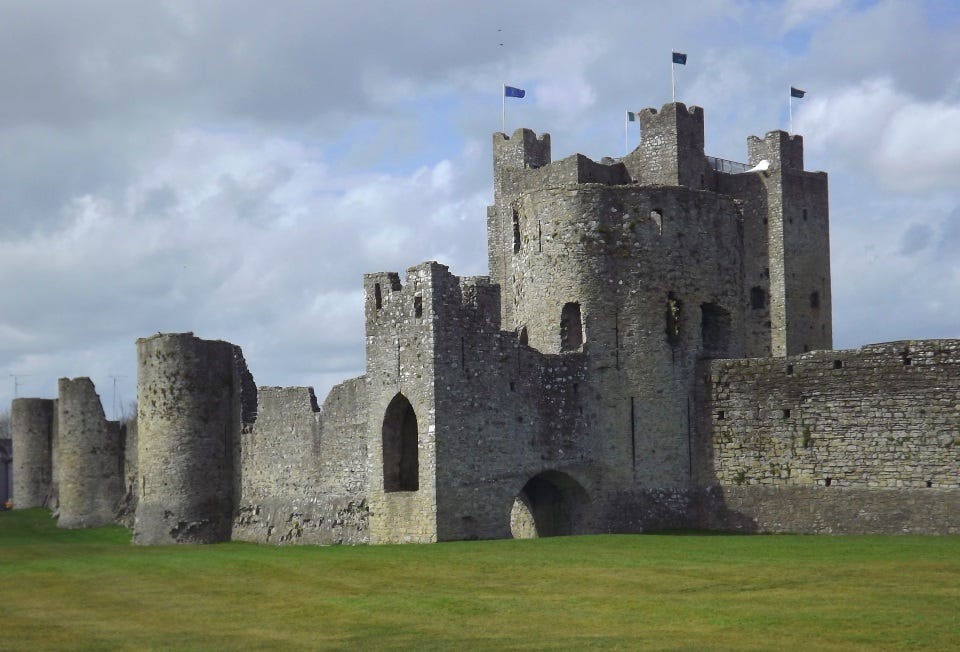 Come with me now, Mary, as we travel forward in time by nearly four centuries, to Trim Castle in County Meath. The contrast is striking. Where the ring fort spoke of defensive necessity, Trim Castle shouts of military dominance. Its massive stone walls rise twenty metres into the sky, dwarfing everything around them.